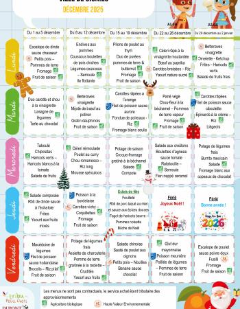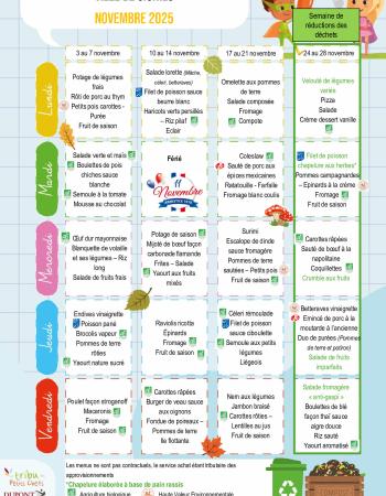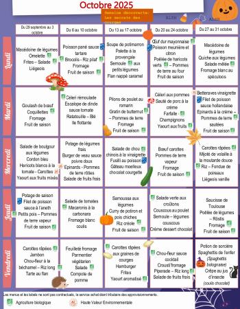 Retrouvez ici les menus prévus pour la restauration scolaire. Menus - Octobre 2025 Consulter Taille: 407.8 Ko Extension: pdf Publié le 16 Oct. 2025 Menus - Novembre 2025 Consulter Taille: 417.97 Ko Extension: pdf Publié le 16 Oct. 2025 Menus - Décembre 2025 Consulter Taille: 501.16 Ko Extension: pdf Publié le 16 Oct. 2025