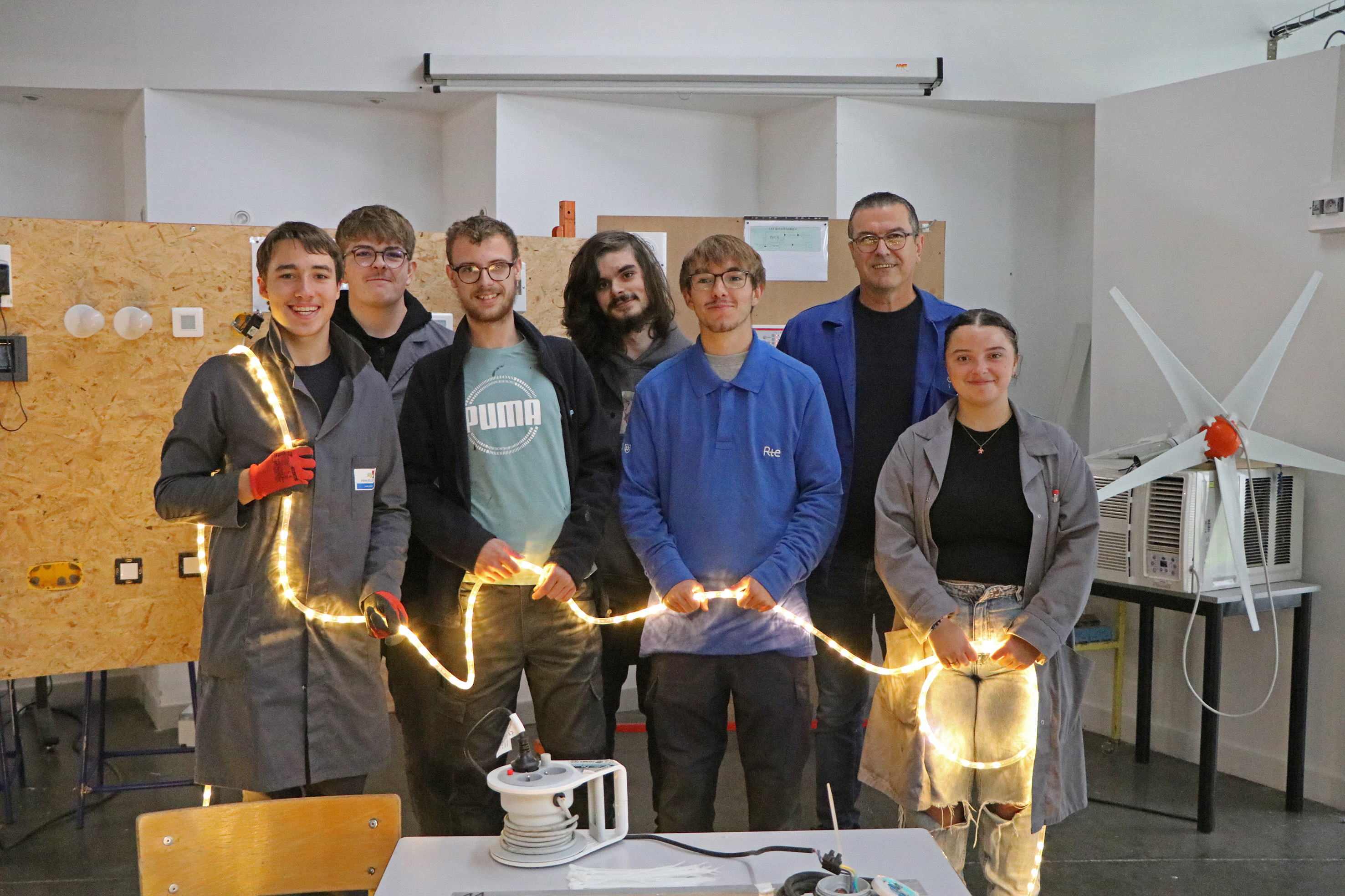 Les élèves de 1ère et de terminale participent à cette opération. Monsieur Cherradi, autre professeur d'électricité s'est joint au projet en intégrant quelques un de ses élèves.